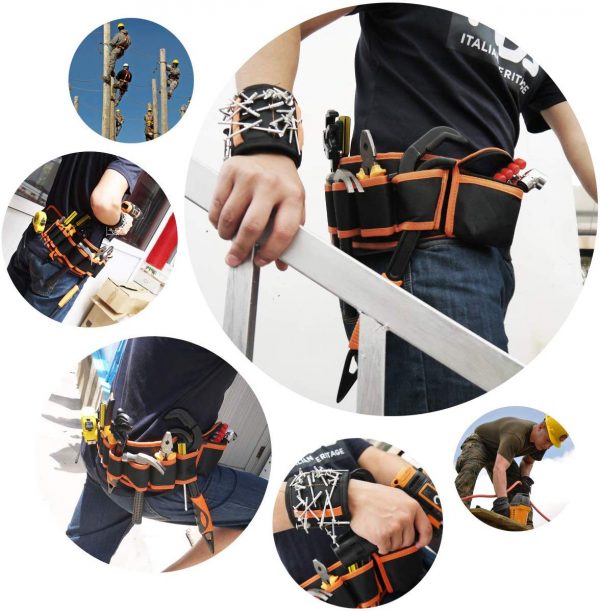 Sicher: Mit einem Hochwertigem Werkzeuggürteltasche und Magnetischen Armband tragen Sie bei sich die am häufigsten verwendeten Werkzeuge, es eignet sich besonders für Dächer, hohe Plätze oder Arbeitsumgebungen, bei denen Hände freigegeben werden müssen.