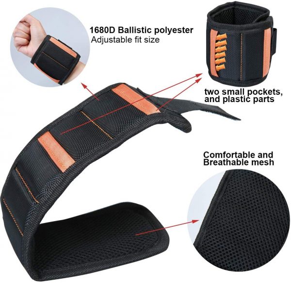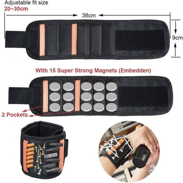 Magnetarmband: Das Magnetisches Armband-Werkzeug hat 5 Reihen mit 15 starken Magnetischer Magnet, Das Werkzeug fällt nicht ab, bis Sie das magnetische Armband entfernen. Es gibt zwei kleine Taschen für nicht magnetische Gegenstände.